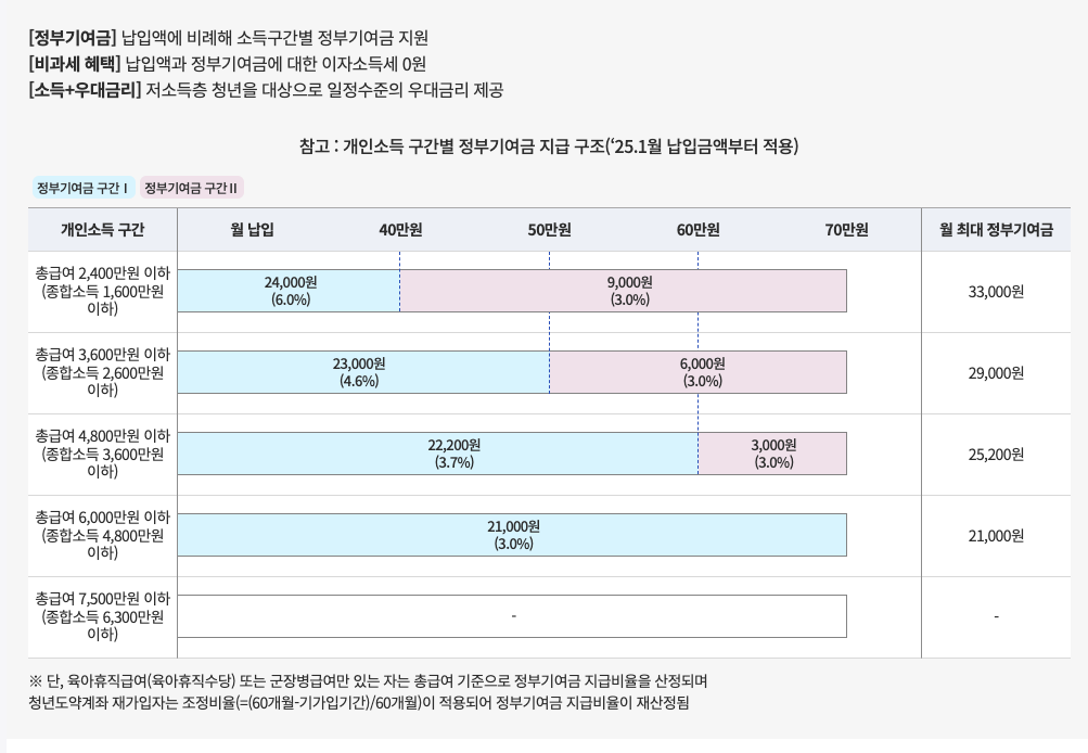 은행 이자와 별개로 정부가 그냥 주는 '매칭 지원금'과 '비과세 혜택'입니다. 이 두 가지만으로도 시중 어떤 예적금보다 2030 세대에게 유리한 상품인 것은 맞습니다.